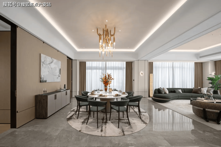 外立面:采用全面屏落地窗+弧形转角玻璃,灰蓝色玻璃与金色线条形成冷暖组合,实现270°环幕视野与自然通风。