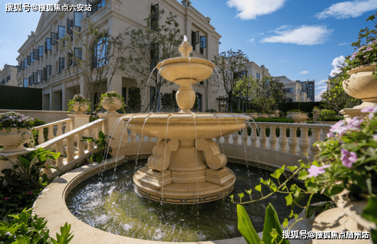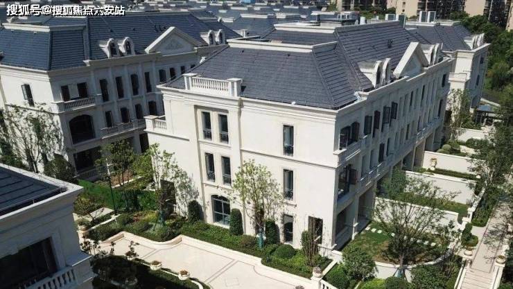 整个园区,以经典的绿城法式墅区景观大中轴贯穿,占地约1000多㎡,联排建筑的设计,融合了中国传统院落布局与法国枫丹白露宫的审美,外立面大面积采用全石材干挂,檐口等细节部位使用仿石。