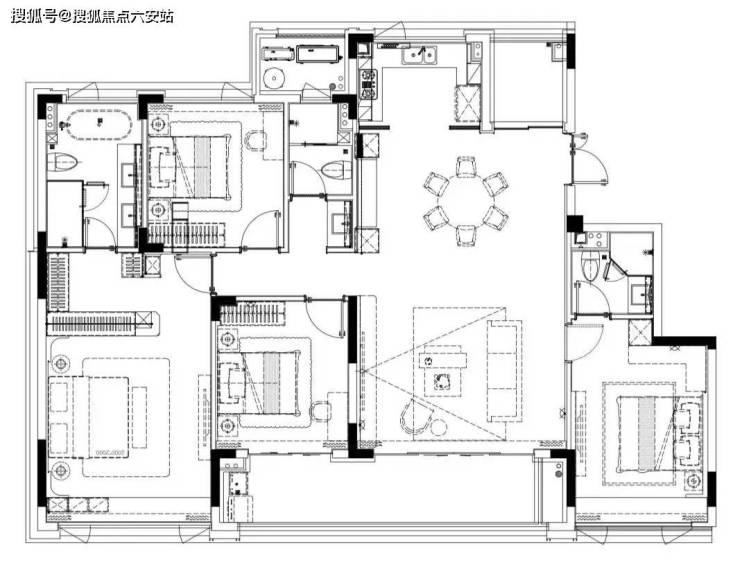 二开建面约182㎡的户型,则是类一梯一户的设计,户型三开间朝南,北向还有个小阳台,实用度满分。
