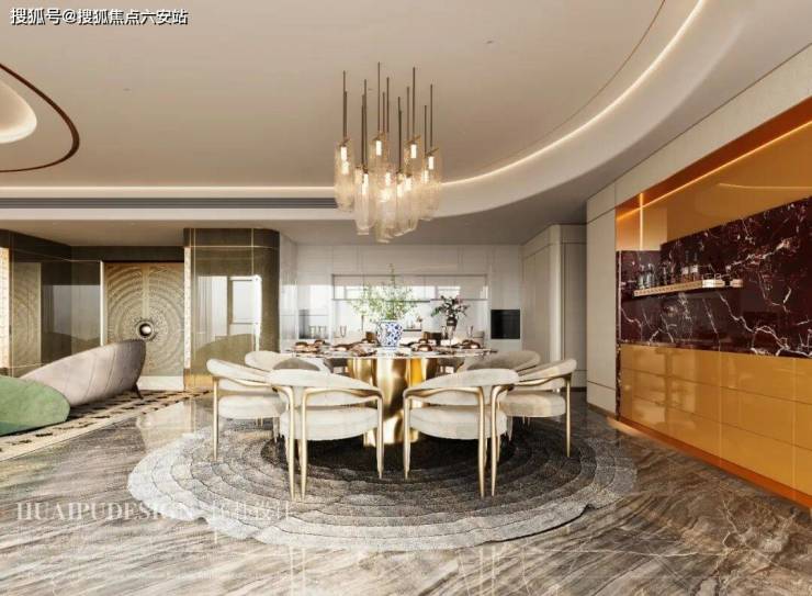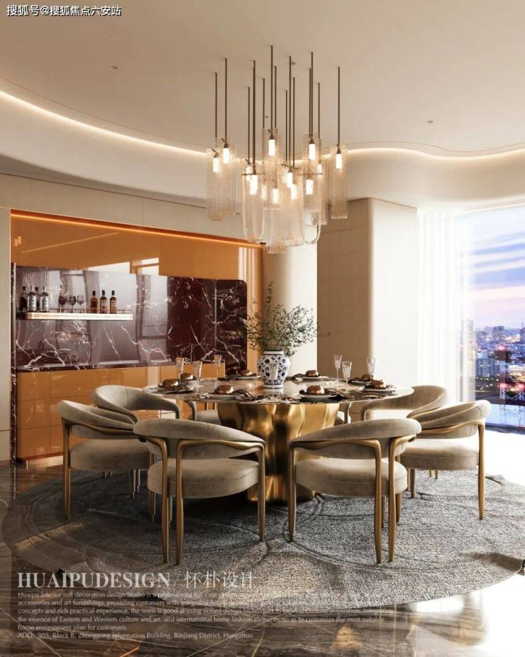 边上的品茶区,青绿石纹如远山叠翠,与鎏金小凳的贵气相融,让东方茶事有了当代的表达。落地窗将城市天际线框成动态的画,煮茶时,看云卷云舒,观城市流转,尽享独属于云端生活的浪漫。