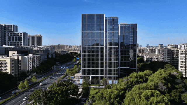建筑风格:采用现代简约风格,立面以铝板和窗墙系统为主,南立面玻璃面占比近90%,犹如银瀑倾泻,展现现代极简审美。