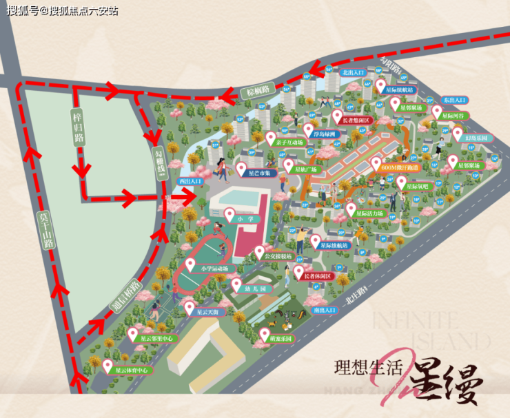 景观树、草坪和流水的有机组合,将自然巧妙纳入主入口围合,带来安宁静谧的感受。东门(建设中)门口打造星际河谷、星邻剧场,是小区次大门,北门(建设中)直通棕榈路,南门(建设中)同样是小区重要入口。