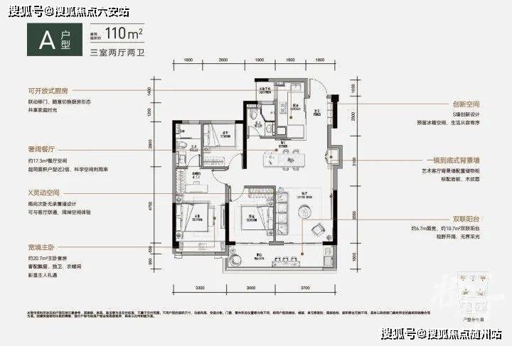 - **建面110㎡三房**:动静分区+南向三开间+6.5米大阳台,主卧套房设计;