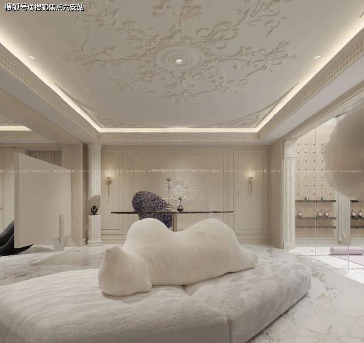 地下室作为本案的亮点之一,采用了现代与法式相碰撞融合的设计。地下室停车区以透光石背景和星空顶等设计,营造出非同一般的归家氛围感。而地下室的活动区则是大量的浅色为主体,给人放松,温馨的感觉。