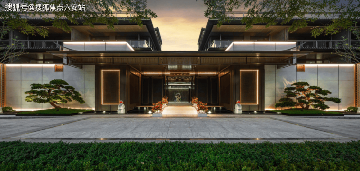 项目以宋代建筑为灵感,采用三重飞檐坡顶、伊朗进口“蓝眼睛”奢石立面,搭配香槟色铝板与三玻两腔玻璃,形成冷暖对比的视觉冲击。归家步道以40吨汉白玉铺就,重现《千里江山图》的山水意境。