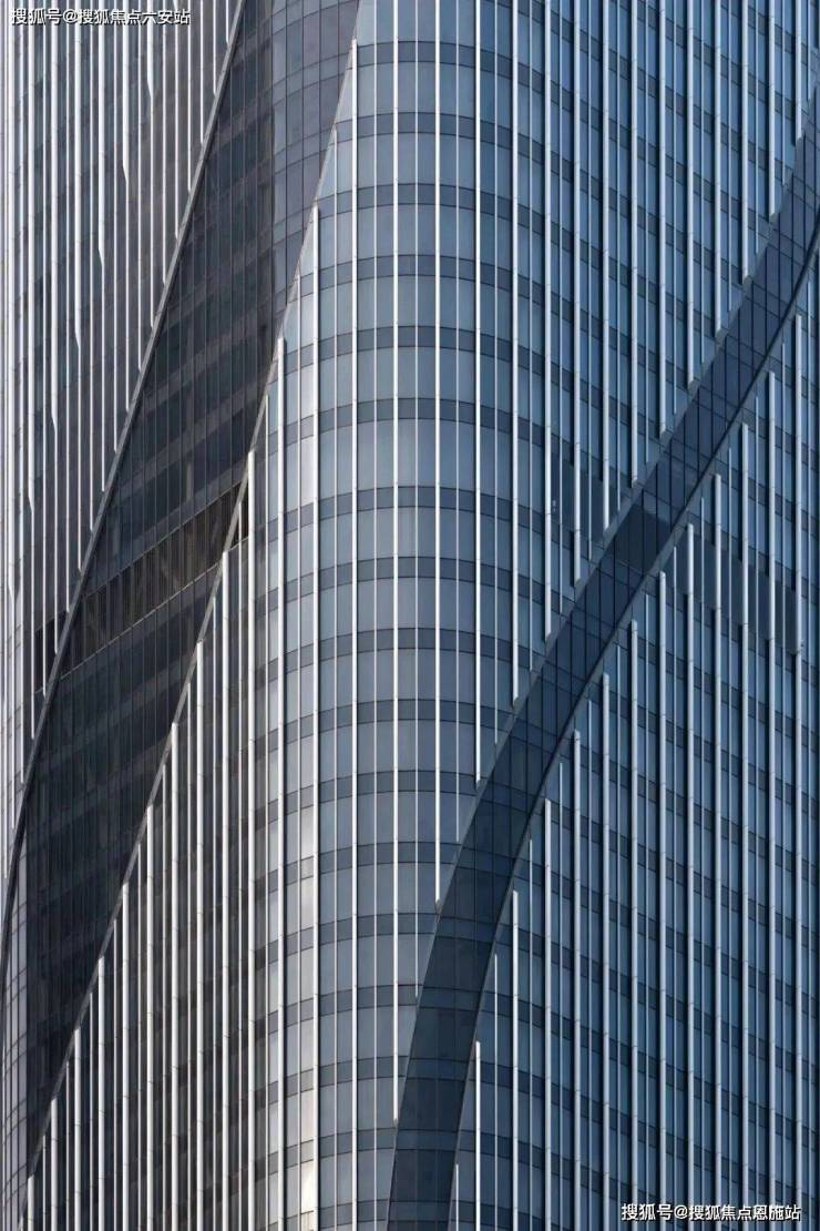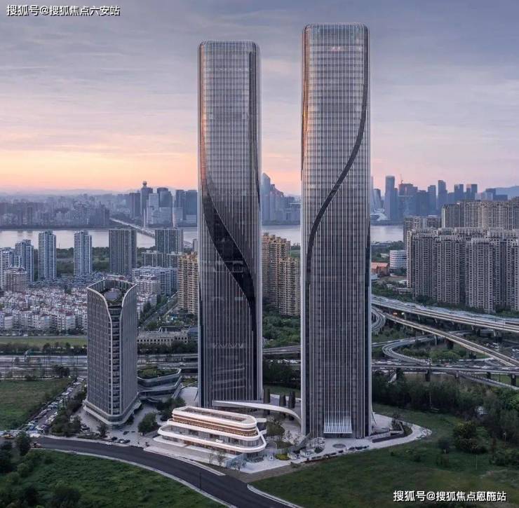 两幢超高层建筑与高层公寓、多层配套辅楼交相呼应。设计从建筑的在地属性出发,将钱塘江奇特的潮汐现象以抽象的手法提炼出来,以建筑形态模拟钱塘江潮起潮落独特的大美风姿,形成一组优雅而富于动感的城市雕塑。设计对塔楼外立面表皮进行竖向线条的精细处理,整体包裹超白玻璃幕墙,配以铝构件线条勾勒缝隙,进退之间丰富了立面层次,强调纵向的延伸感也让视觉张力更加突出。