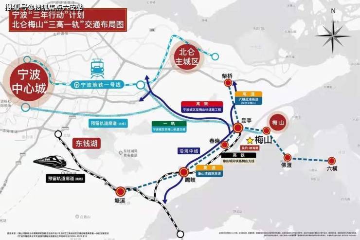 梅东国际邮轮始发港、梅东二类通用航空机场、象山城际宁波-梅山城际铁路、北仑-梅山轻轨(梅山设6个站点)