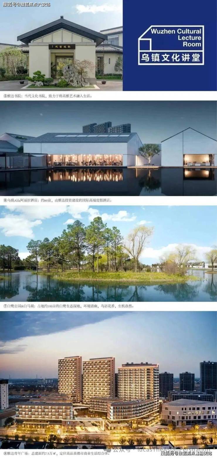 商业配套方面,项目距离乌镇东栅景区商业街约 2 公里,那里聚集了特色商铺、传统餐馆、手工艺品店等,可体验乌镇的民俗文化与美食;1 公里范围内有乌镇时代广场,涵盖超市、影院、餐饮等业态,满足日常购物与娱乐需求;社区自带约 1.5 万平方米的商业街,引入便利店、生鲜超市、药店等,方便业主的日常生活。