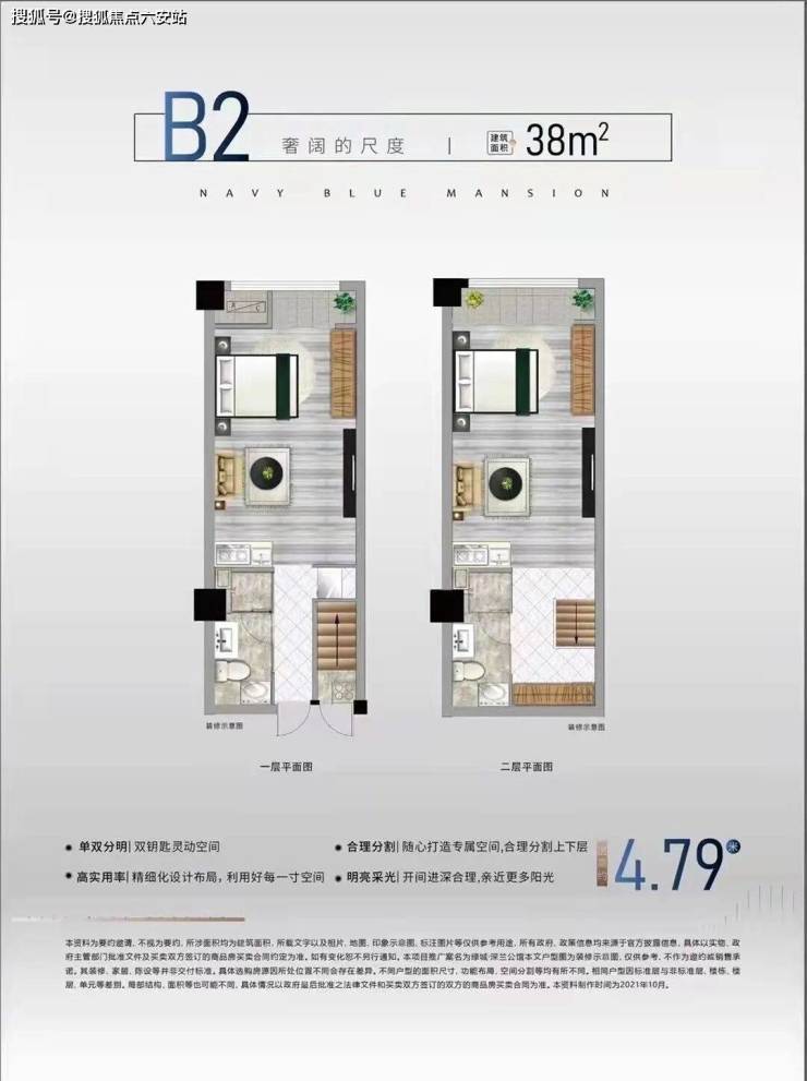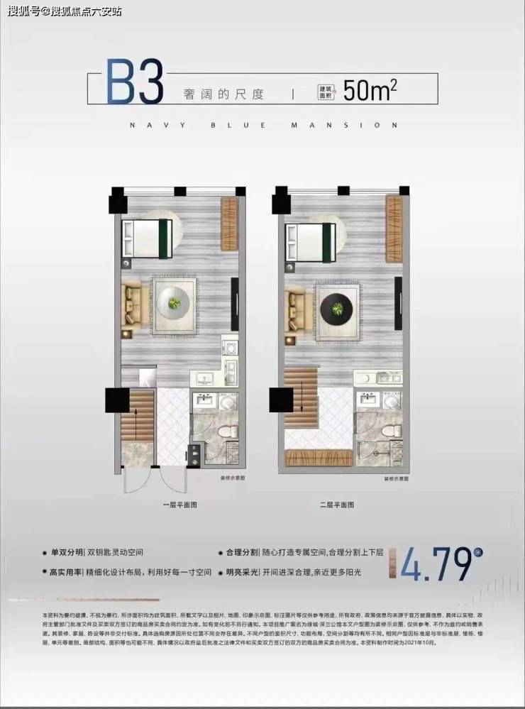 深兰公馆的产品设计极具创新性,主打“双钥匙LOFT”户型,建筑面积约33-50㎡,层高4.75-4.79米,采用独立双入户设计,实现“买一层享两层”的高空间利用率。