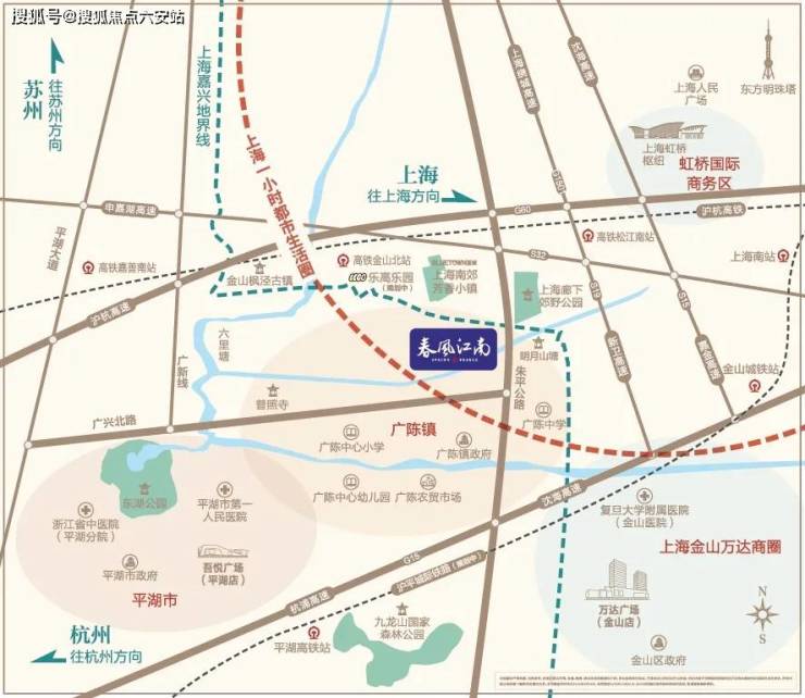 春风江南坐落于嘉兴平湖广陈镇,与上海仅一河之隔,距离东方明珠约63公里,是距离上海最近的蓝城田园小镇之一。