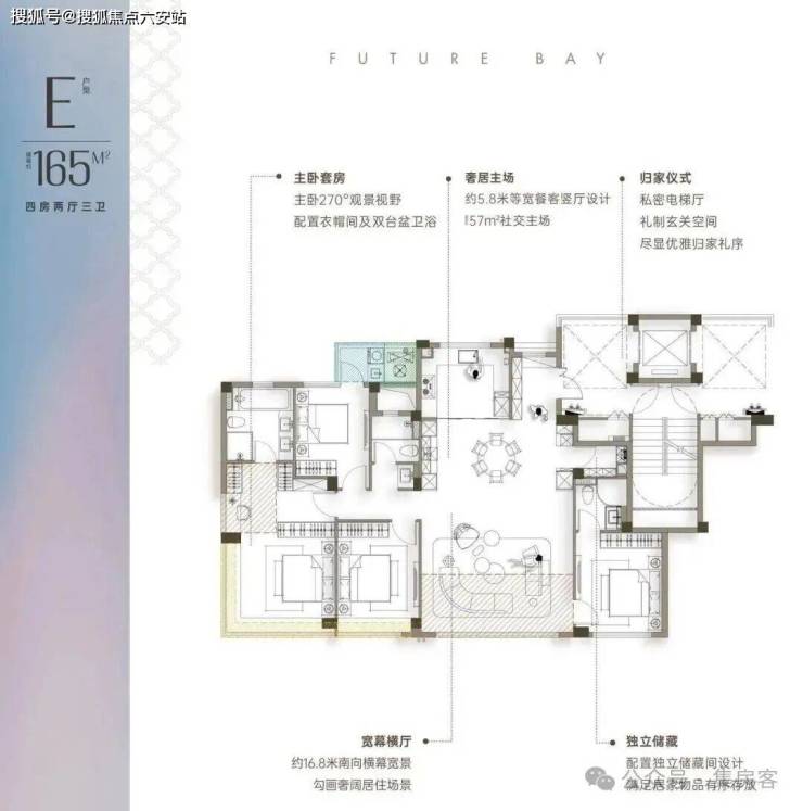 约165方户型,16.85米超大南向开间,超过市场所有同面积段产品;标配储藏间。