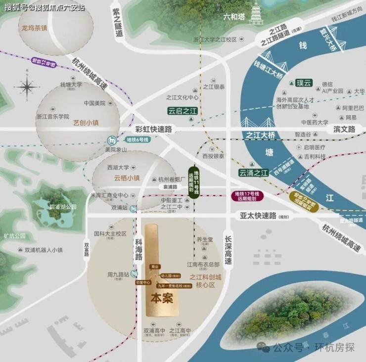 除了地铁,项目周边有彩虹快速路、紫之隧道,开车到滨江大约20分钟。远期还规划了三条跨江隧道,进一步拉近之江和滨江的距离。如果你在城西或城南活动,这里的交通网络能覆盖大部分需求。