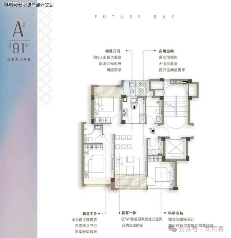 建面约91方真三房户型,真南北通透洋房产品北侧无消防连廊设计,小面积也是真南北通透,区别市面2+ 1户型,最小的卧室也有将近9个平方,每个卧室面宽均达到3米及以上
