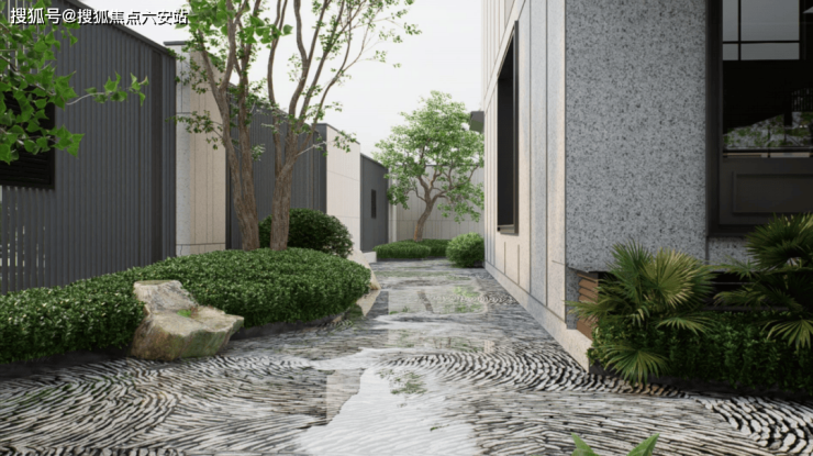 金翊·金云院的“新中式”并非简单堆砌传统符号,而是以“当代文人生活”为内核,实现“形意兼备”。整个景观动线以“起承转合”的序列打造“三进式归家礼序”,一进威仪大堂,二进坊巷里弄,三进庭院入户,以路径为主线进行物理连接与视觉引导,以“节点”景观创造节奏与体验焦点。