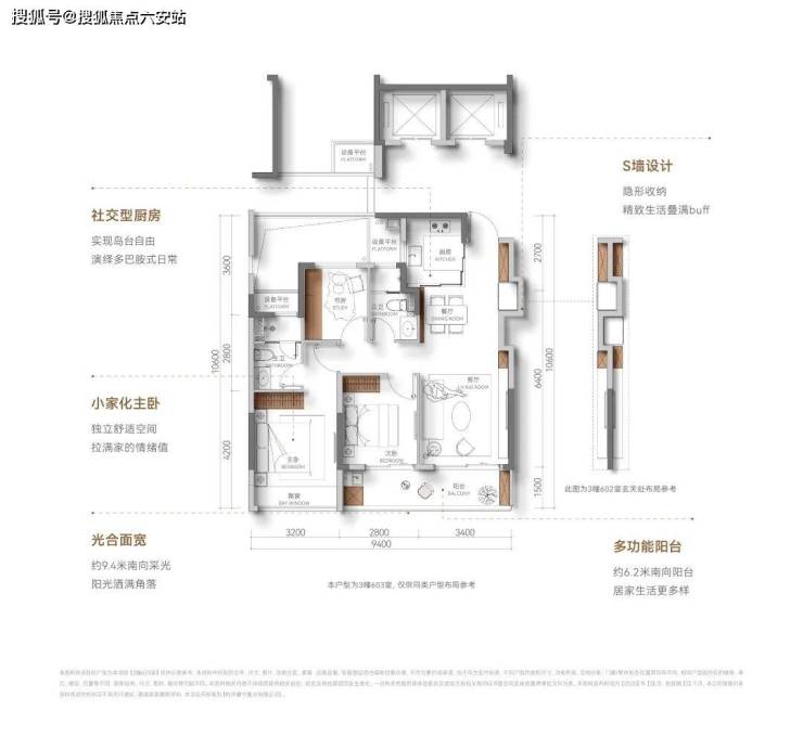 建面约96m灵动三房凭借创新S墙与社交厨房,为初建家庭