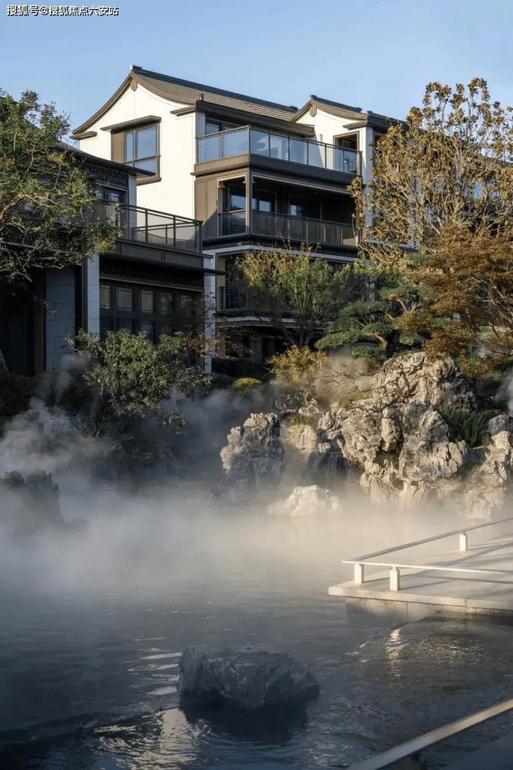 新中式建筑美学:灰墙黛瓦、飞檐翘角、对称布局,融合《富春山居图》意境,打造“可居可游”的东方雅韵