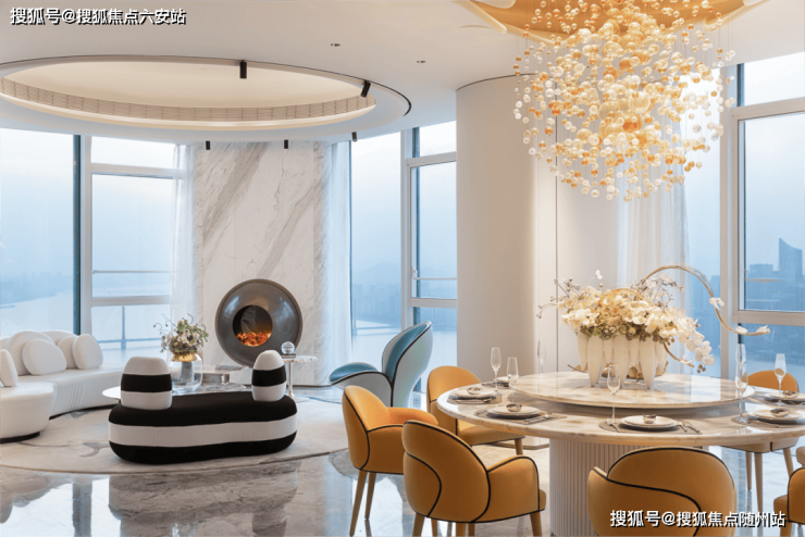 大尺度的景观视野,远眺钱塘江水,曲线包装转角结构柱,给客厅一个安定墙面及视觉焦点,窗外就是地标性的莲花元素,杭州奥体中心(大莲花),以及国际会议中心(大金球)。
