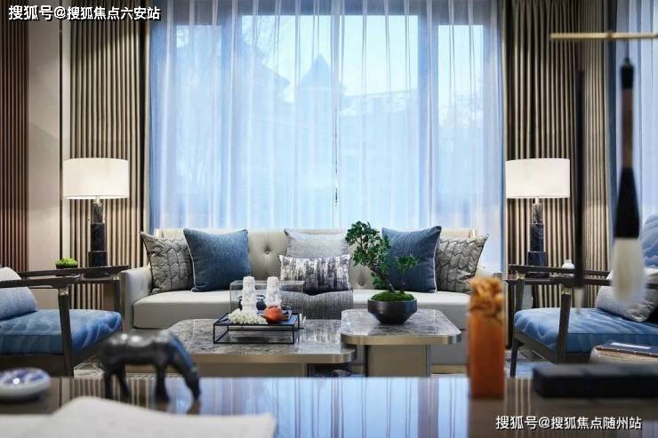 走入空间,可见水纹的柔美点染于软包、画饰、地毯等软装上,渲染出怡人舒适的空间氛围。三扇大面积玻璃门窗,将四时风光纳入框景中,邀人坐看自然的生机、时间的足痕。