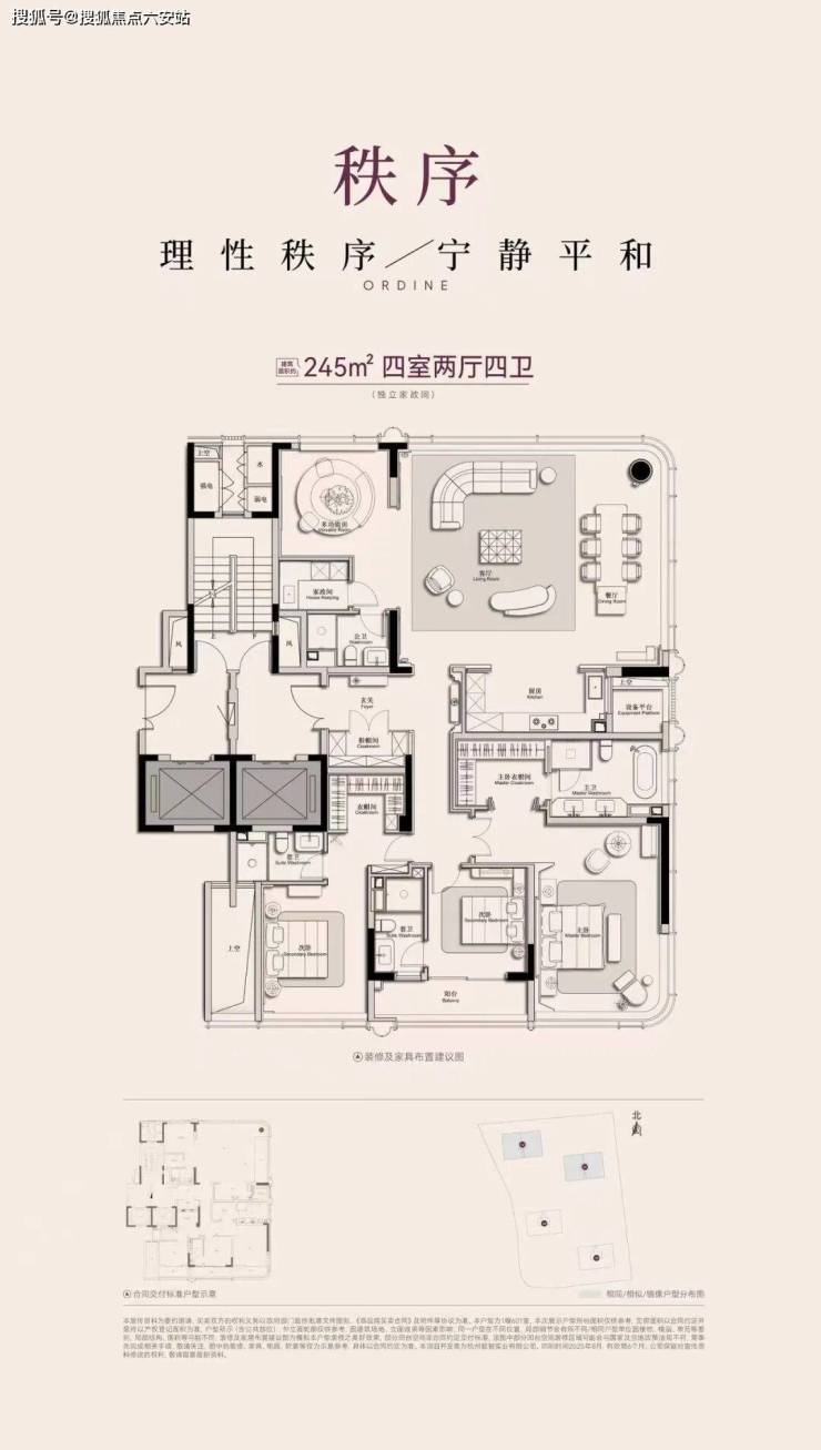 大家咏印明庐容积率仅2.4,绿化率高达35%,在主城核心区打造低密纯粹的顶豪社区氛围。项目主力户型覆盖建面约205-380㎡,涵盖 205㎡四房两厅三卫、245㎡四房两厅四卫,以及 300-380㎡顶层跃层等多种形态,类一梯一户设计保障极致私密性,主力户型层高约3.15-3.3 米,得房率高达88%,空间尺度奢阔,利用率拉满。项目为精装修交付,采用约10000 元 /㎡顶豪装标,配备德国美诺厨电、大金中央空调、菲斯曼地暖等国际一线品牌,交付时间约为2028 年 3 月。此外,项目车位配比达1:1.9,实行全人车分流,搭配大家物业专属管家服务,物业费约9 元 /㎡・月,为业主提供全方位尊崇服务。