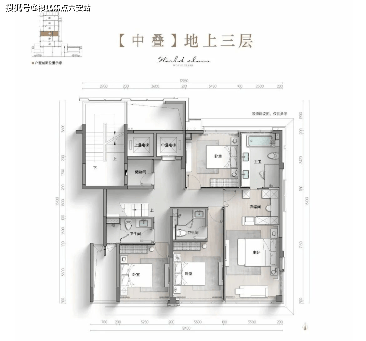 它的户型跟中下叠不一样,中下叠的格局都是居住区四个房间,包含朝南的三个套房。而上叠的居住层只有三个套房,北面是没有卧室的,取而代之的是一个步入式衣帽间。所以上叠的主卧是更加宽敞的。