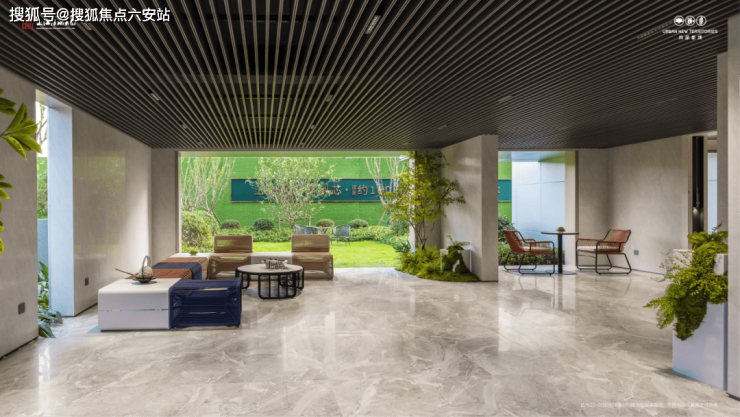 电梯厅墙面铺设大面积岩板,吊顶也颇具设计感。