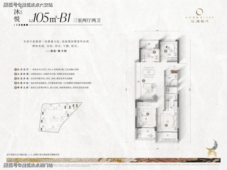约105㎡有两款,我称之为“横竖双王炸”:一款是“四开间南小户型”,每个房间都向阳,还是准双套房。另一款是少见的边套小户型,自带约6.1米大边厅。