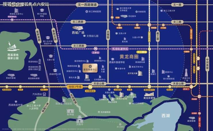 黄龙商圈辐射:位于黄龙商务核心区,2公里内聚集200万方写字楼集群,与浙商财富中心、天目里等企业总部形成“职场-居住”的无缝衔接,高净值人群的聚集效应显著;