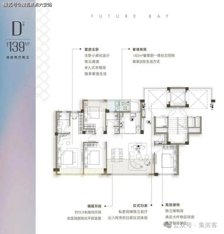 约139方户型, 4.5开间朝南+储藏间,南向15.9米超大采光面,做到五开间朝南的空间,标配储藏间,三个南向卧室设计。