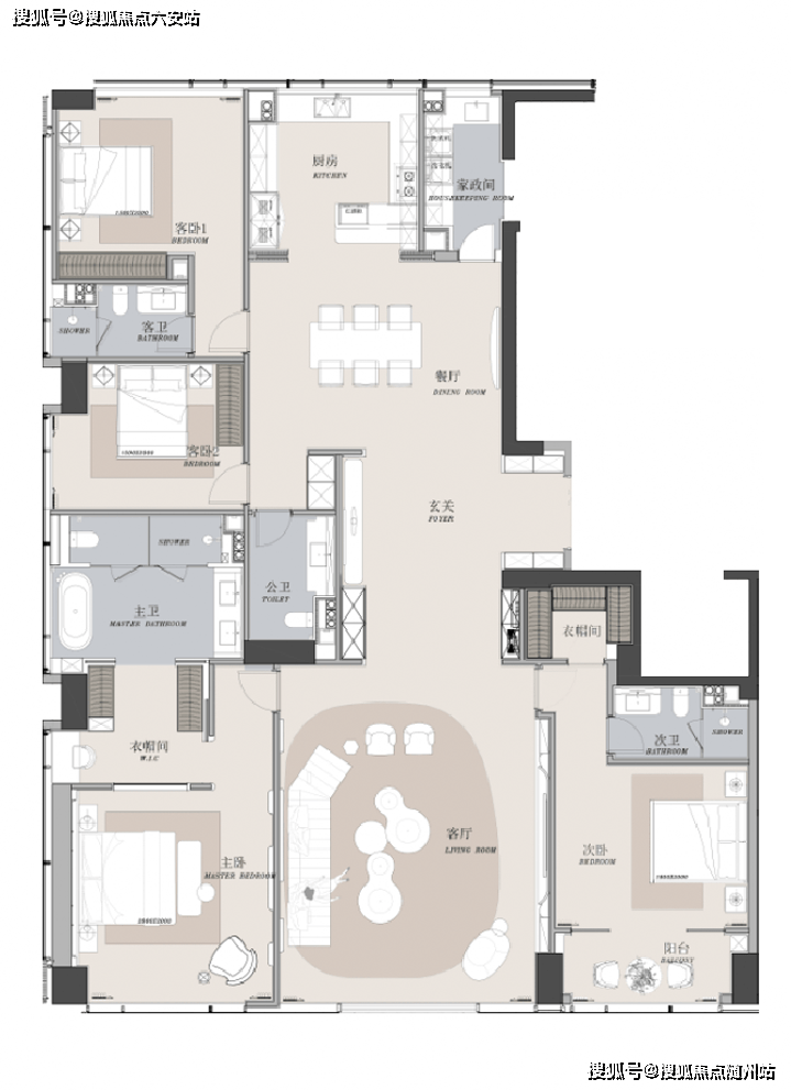 - **国际奢装标准**:德国柏丽橱柜、杜拉维特卫浴、大金中央空调,墙面满铺卡拉麦里金石材,主卧套房配备卡德维浴缸、瑞士劳芬双台盆,对标千万级顶豪。