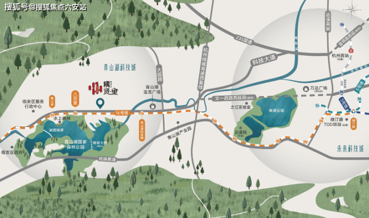 【核心区位】杭州临安区青山湖科技城,地铁16号线八百里站东侧,青山湖跨湖大桥北起点(纵横双轴交汇)