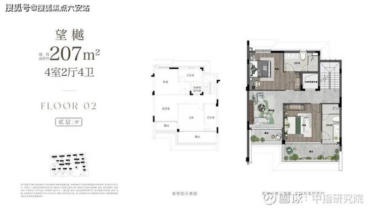 在产品设计上,项目创新实现了大面宽、高「院房比」,拥有极致尺度与通透感。以建面约207㎡四房四卫户型为例,一层客餐厅面宽达约9米(远超杭州上一代排屋约7米的普遍水平)。巨幅落地玻璃取代传统实墙,最大限度引入自然光、清风与庭院景观,实现室内外交融无界。