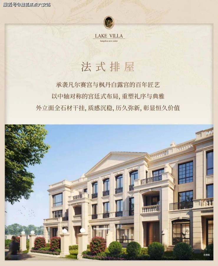 低密法式大宅: 法式排屋、阔幕叠墅、观景华宅。法式排屋主力400方起,恢弘尺度冠绝杭州,近乎绝迹,成就时代传世之作。
