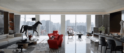 客厅地面是劳伦黑金和雅典白玉大理石拼花,挪威绿背景墙的水纹倒映着运河的波光,沙发是围坐的天伦之乐,茶桌有闲适的品茗之美,展陈你从苏富比拍来的名画,圆桌觥筹交错享四海美食,阳台是闺蜜们欢笑的下午茶,也是孩子们欢腾的游乐场。