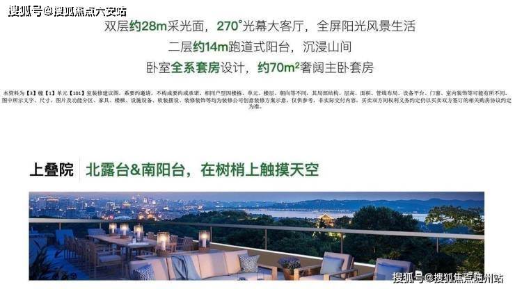 项目层高达3.85米,超越常规低密产品30%,为吊顶、智能家居系统留足空间;270°环幕露台最大开间27.2米,部分延展至34米,搭配巨幅落地玻璃幕墙,实现山景、江景全景渗透。