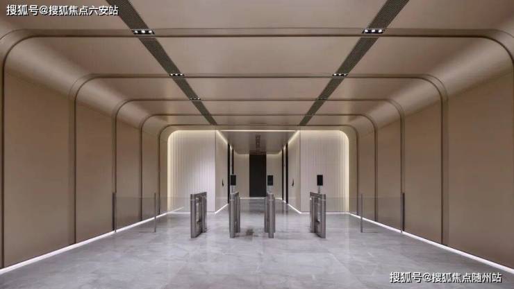 楔形空间由外向内从两层高度逐渐过渡到一层高度,对应从大堂向电梯厅的空间自然引导,将不利空间转化为特色空间,使未来天空中心办公空间表现出与众不同的场所特质,具有独特的标识性。