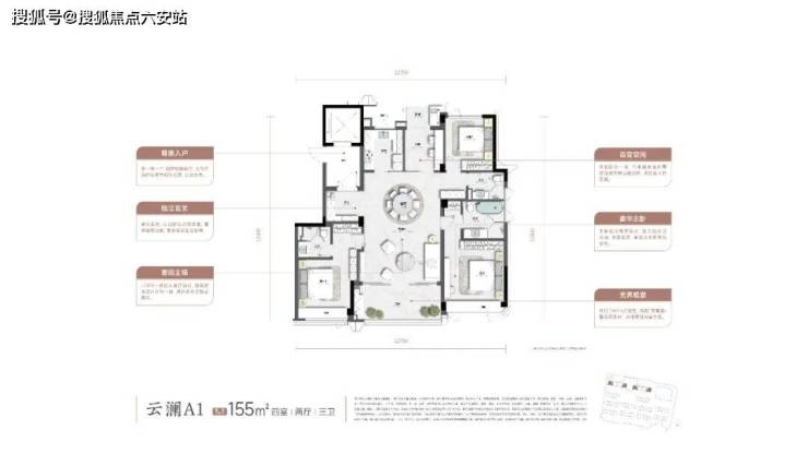 建面约155㎡户型实现约12.7米南向面宽、双阳台及准三套房布局,得房率约90%,实际体验堪比180㎡产品。