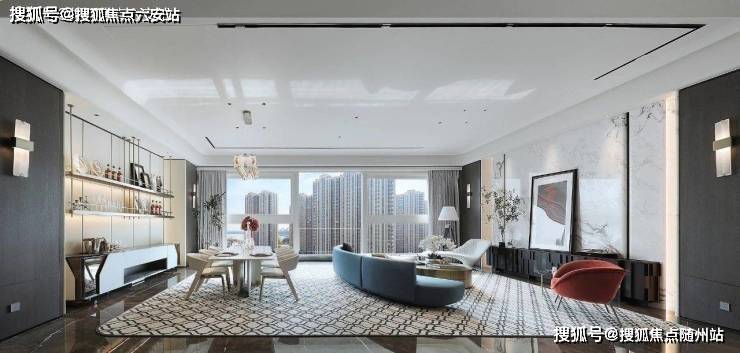 客厅:19米超大面宽搭配270°环绕视野,钱塘江柔美曲线融入弧形吊顶与奢石拼花;