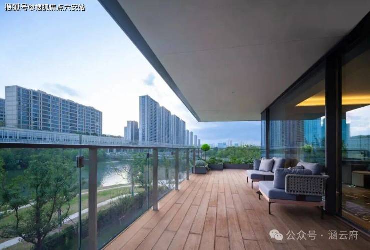 阳台进深约2.44-3.34米,错落如“空中观景台”,将河景与社区景致拉成巨幕画幅。
