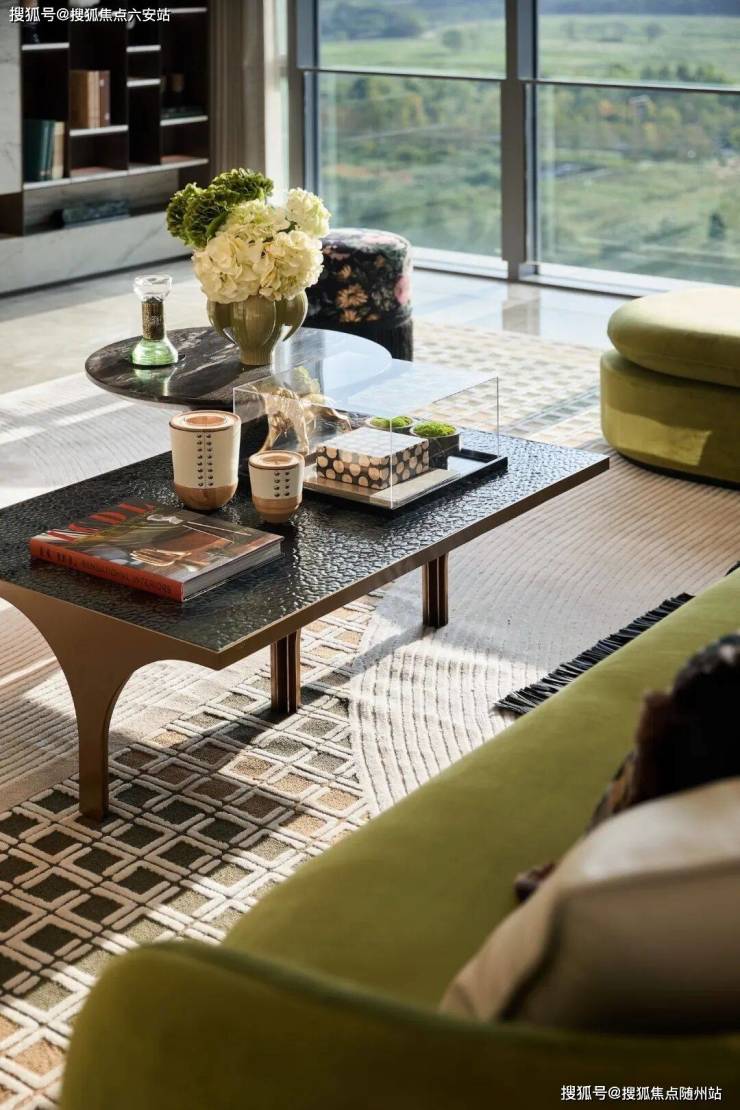 Metropolis咖啡桌的虹彩玻璃桌面漾起粼粼波光,拱门造型底座与门厅玄关的拱门玻璃遥相呼应。马尔斯绿主沙发与电视墙旁单人沙发上的自然图案交织,既勾勒出"既有面子,又有里子"的生活腔调,更彰显每件软装皆是"多元共生"的设计宣言,让日常社交化作艺术品鉴的雅集。