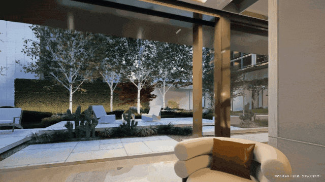 门前是同价位楼盘很少见的日本黑松,树龄有几十年。穿过主入口,迎接你的是美术馆般的巨幅玻璃框景。