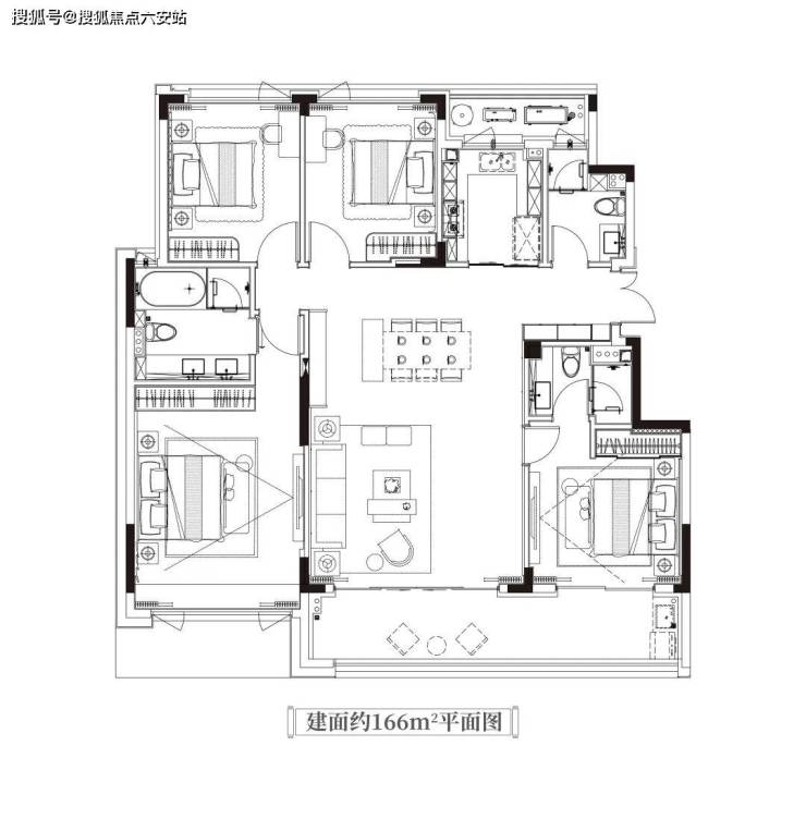 4房2厅3卫的166㎡户型,进门用功能丰富的玄关遮掩室内,其后你会在室内感受到少有的豁然开朗。