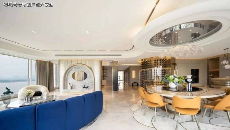 玄关处,整面渐变曲面艺术玻璃,映射若隐若现的江景;客厅中,钱塘江的柔美曲线,融入弧形吊顶与奢石拼花;19米的超大面宽,以270°环绕视野尽揽钱塘江景,让江河倒影和城市天际线在家中交汇。这是建筑与自然的对话,更是生活与艺术的融合。