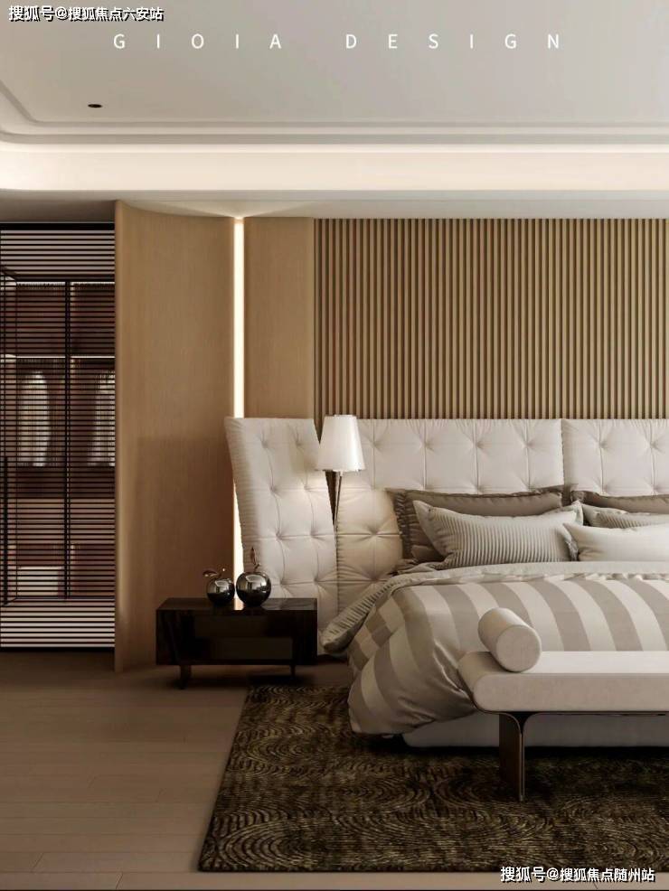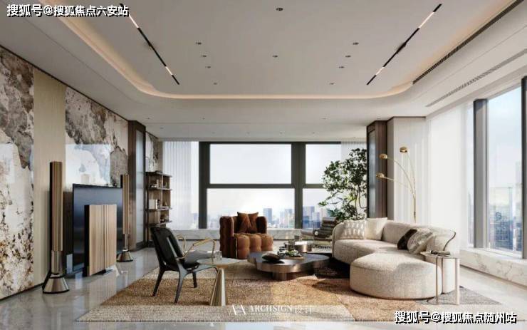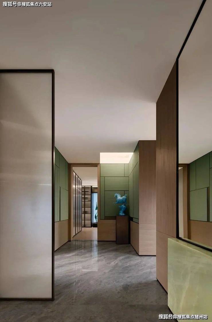 东区建面约320户型,将艺术感进一步融入日常中。特别设计的专属门厅空间,是从电梯厅延伸到家,如同一处艺廊,放慢人的情绪;室内选用了浅金色奢石(外界也称其为“芬迪白大理石”)作为主要的石材,曲面的木饰面也为浅色,整体给人以明亮感。