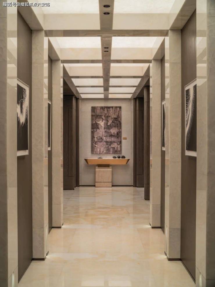 步入门厅,便是层高约4.2米的空中艺廊,从地板到天花,皆为白色玉石通铺。