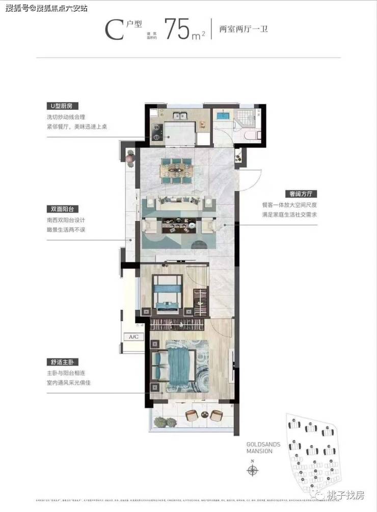 高层75㎡:两梯六户,双飘窗拓展空间,U型厨房+干湿分离卫浴,小户型也能实现南北通透。