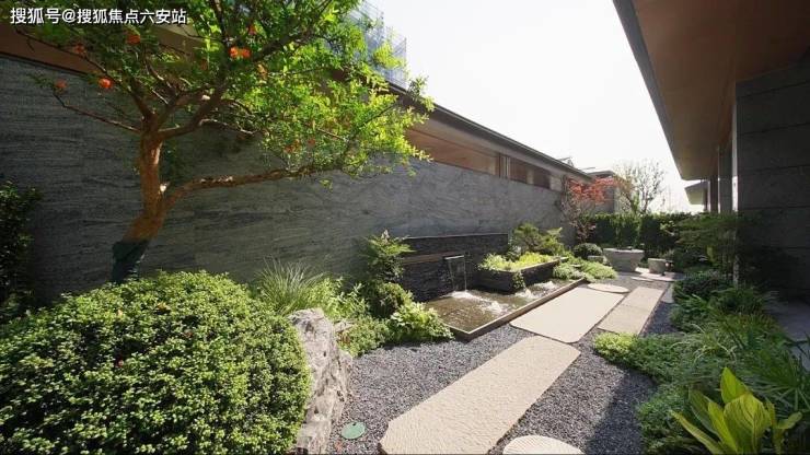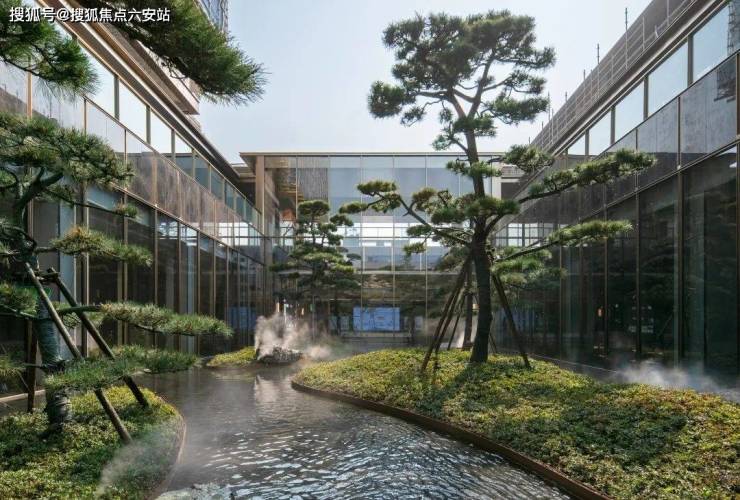 五棵精挑细选的黑松从溪涧中生长向上,山石造景的工法让水变得曲折,经过两重叠水,飞流直下,冲击出悦耳的白噪音和一幅李唐笔触下现代版的清溪渔隐图。