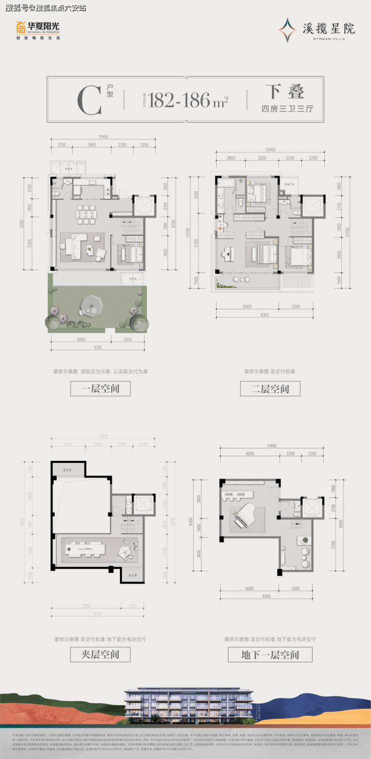 以C户型下叠为例,约18.6m南向大面宽(双层),无界风景延伸入室;270°环幕采光,尽情沐浴暖阳。在珍存的低密土地上