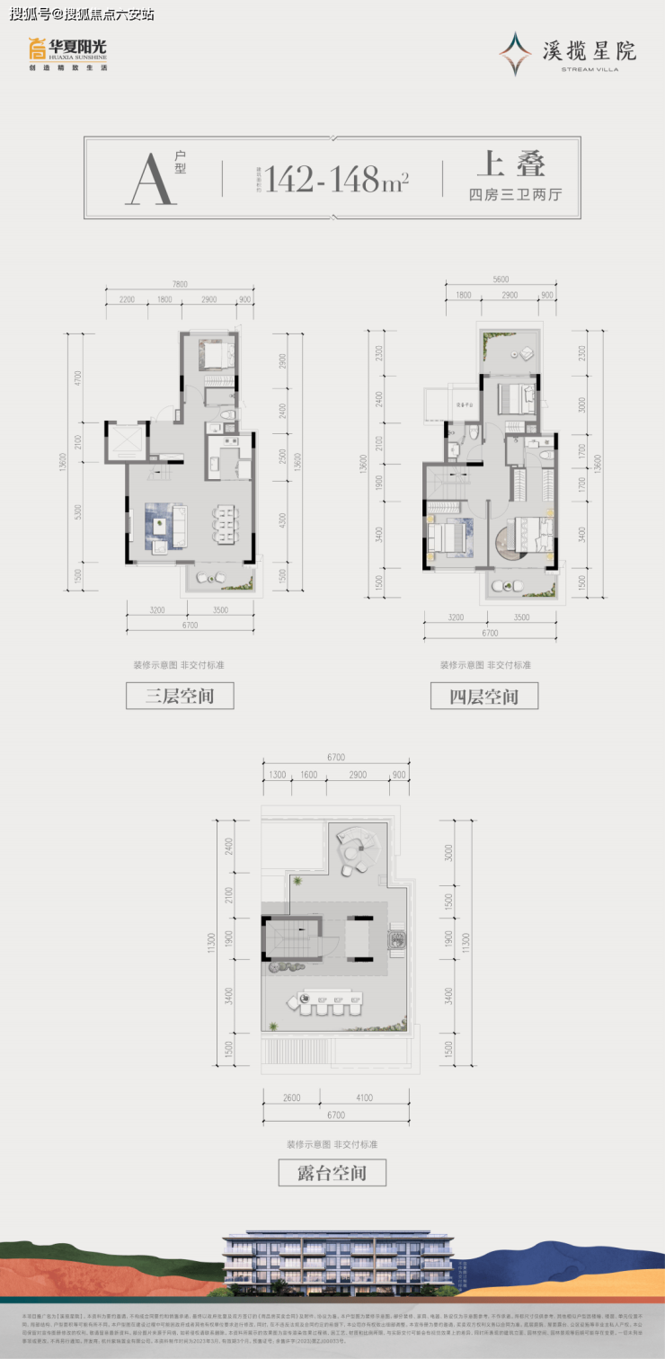 建面约142~148㎡上叠:约6.7m餐客连厅/豪华主卧套房/顶层景观阳台/U型厨房