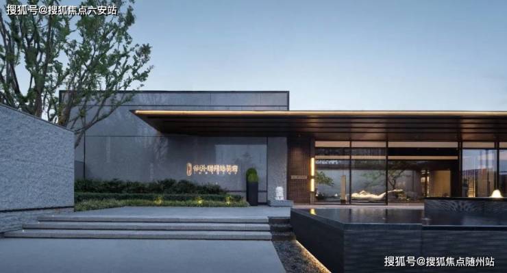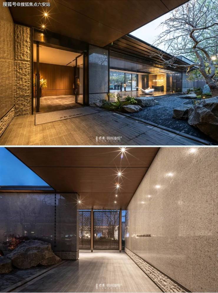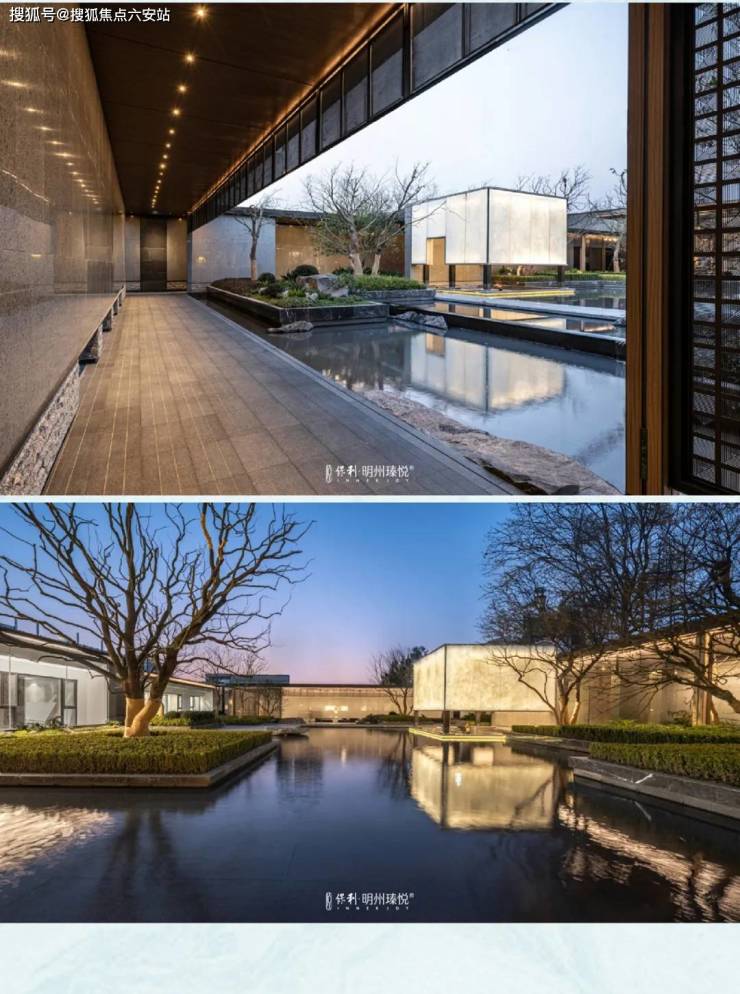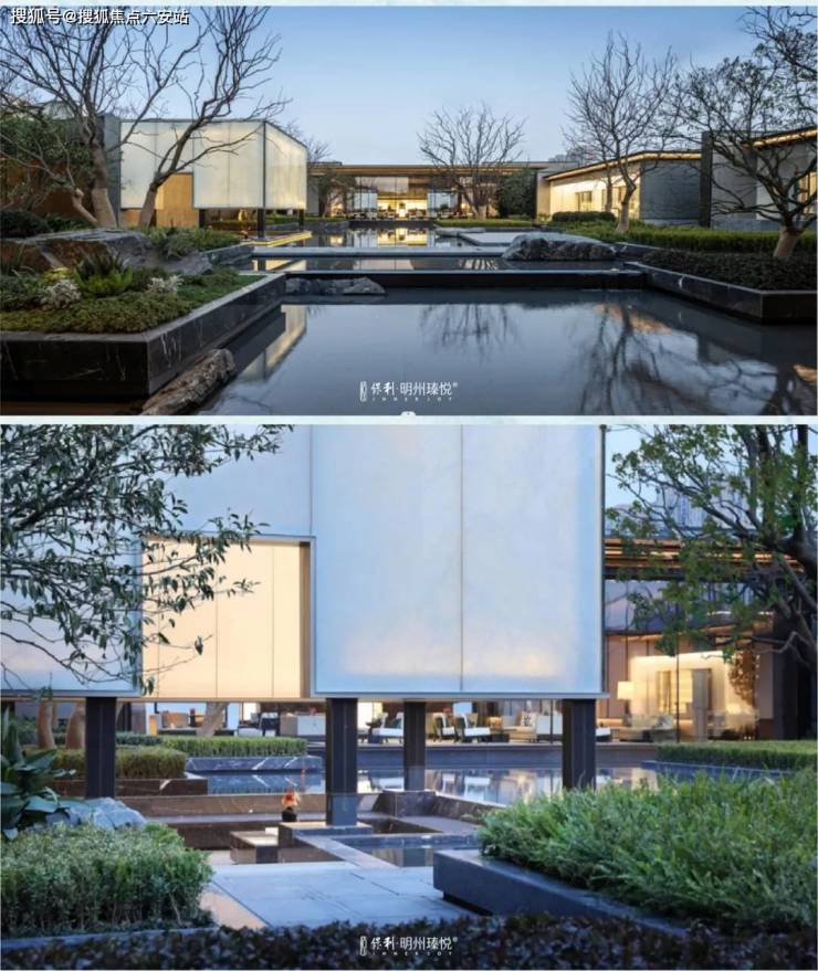 建筑整体方正硬朗、沉稳大气,两侧搭以朴树和精致花境,营造充满东方美学的礼序入口。视觉中心处,山石横卧于水景之上,与泮池砚台相映成趣。长砚迎宾,赋予归家礼仪的尊崇感。