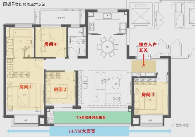 数据说话,约14.7米大面宽,约7.8米的双开间阳台,同时进深也相对合理,面宽进深比,属于中大平层产品里的“黄金比 例”。